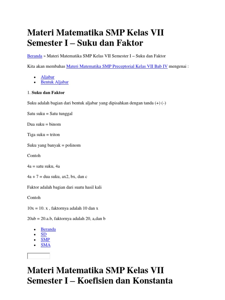 Faktornya adalah 10 dan x 20ab = 20.a.b, faktornya adalah 20, a,dan b. Buku materi pembelajaran ipa kelas 7 kurikulum 2019 revisi 2020. Materi matematika smp kelas vii semester i koefisien. Apa saja materi matematika kelas 7 kurikulum 2013 untuk semester 1 dan 2? Benar sekali pelajaran matematika memang berkaitan dengan hitung menghitung untuk kita perlu memahami konsep dasar dari operasi.