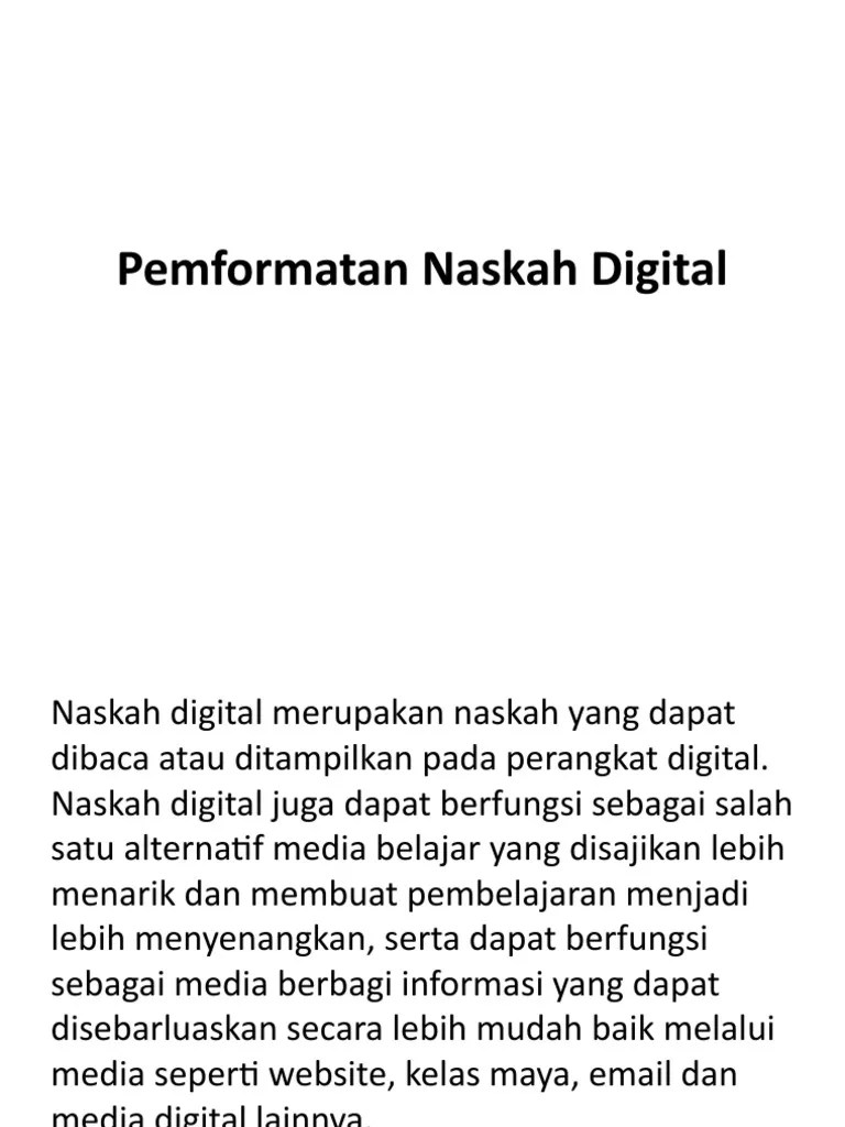 Pertimbangan Pemilihan Format Naskah Digital Yang Akan Digunakan Adalah - 3 Jenis Format Buku Digital Berikut Beberapa Format Yang Tersedia Untuk Buku Course Hero : Sebelum penulisan naskah dimulai, terlebih dahulu menuliskan treatment yang akan digunakan dalam penulisan naskah.treatment adalah uraian berbentuk essai yang menggambarkan alur penyajian program yang akan disampaikan.